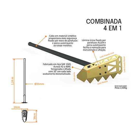 Multifuncional que agrega funções distintas em seus 4 lados que tanto servem para abertura de canais como remoção de vegetação, entulho e rastelo.
