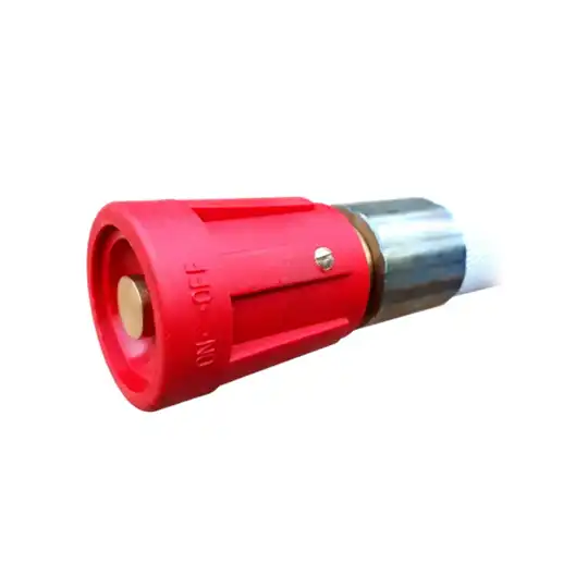 Esguicho: Corpo interno em latão e manopla para regulagem de abertura e fechamento em borracha vermelha